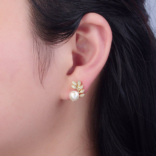 White Pearl Stud with Gold Pave Leaf Earrings