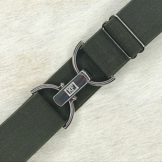Olive solid elastic belt in 1.5" width. The slide allows the belt to be adjustable from a 20 inch waistline up to 60 inches. Once adjusted, the slide will stay snugly in place. This popular belt will fit most jeans, slacks, and riding breeches. Features a gold tone surcingle buckle and gold tone hardware.