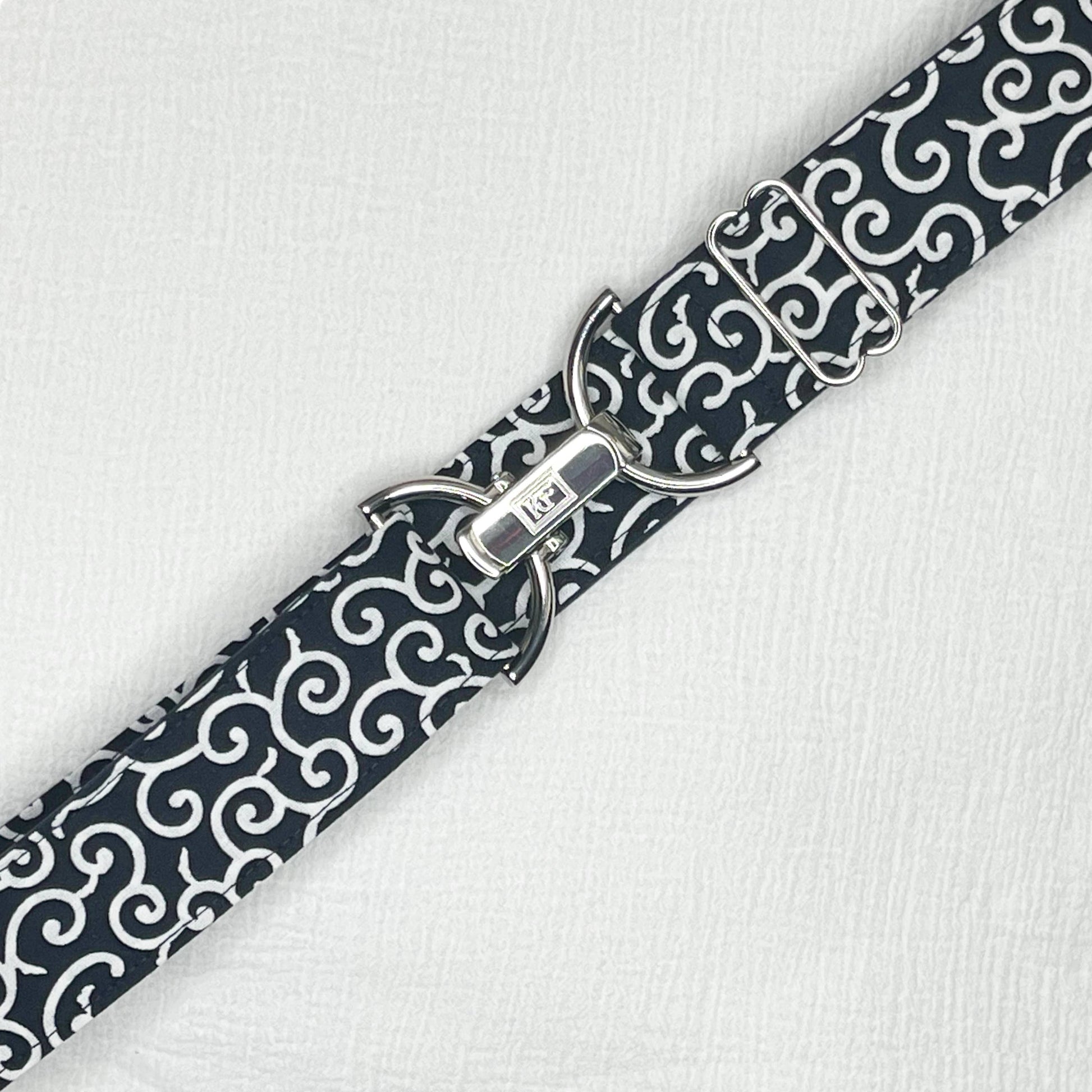 Our belt is made with navy swirl fabric and navy fabric backing.