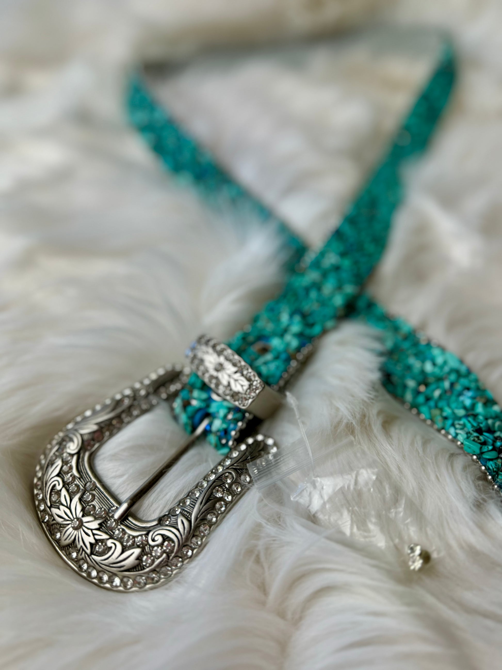 Enhance your outfit with our Turquoise Stone Bling Leather Belt. The stunning turquoise stones and silver accent bring a Western style to your look. Perfect for concerts, rodeos, or everyday wear. Upgrade your accessory game and stand out from the crowd!Ā